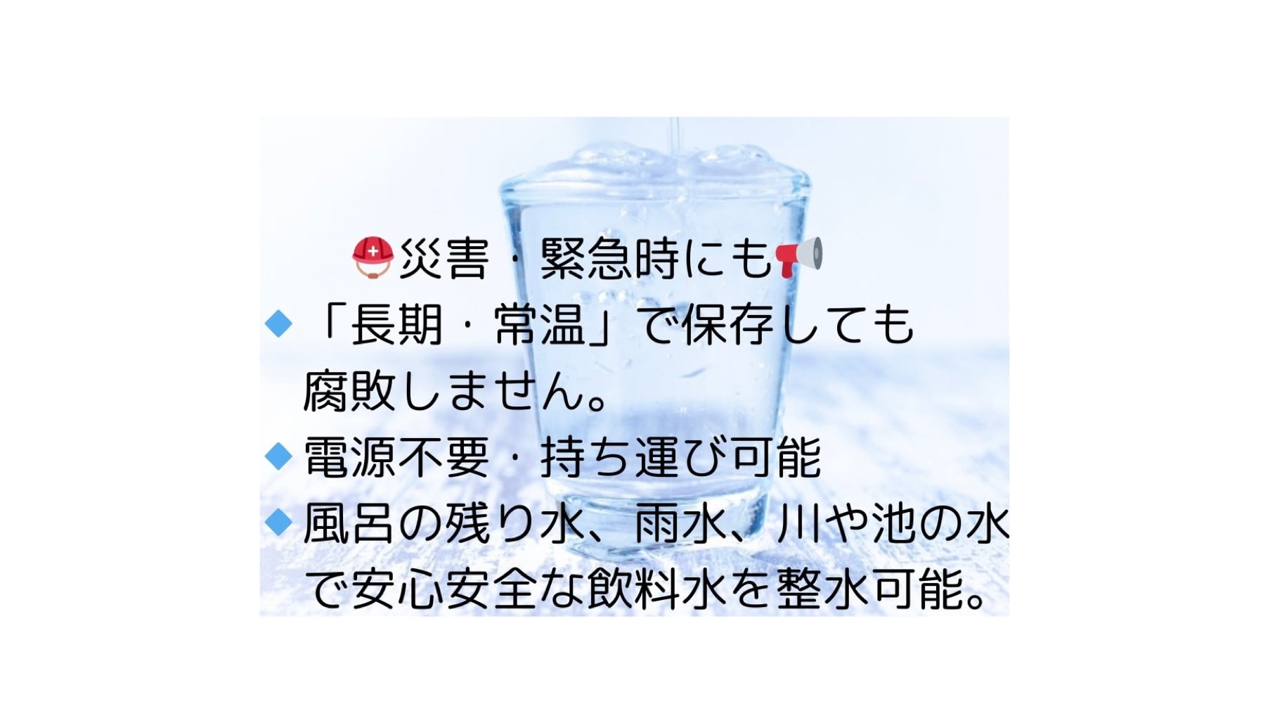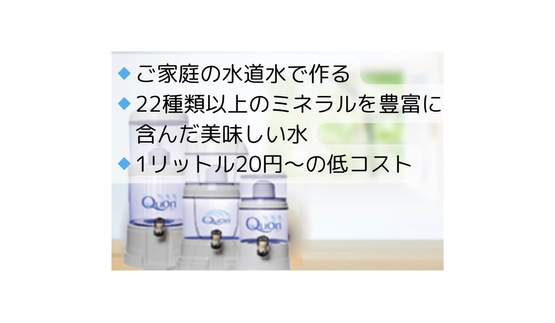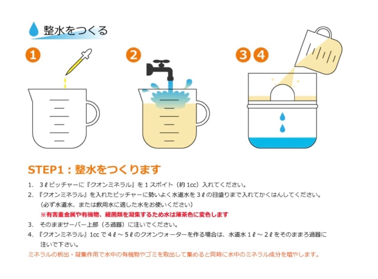 【商品説明】 天然の「微量元素ミネラル」をバランス良く豊富に含有した岩石を特殊な技術(特許取得済)で溶解して、液状に加工した製品です。 有害な化学物質や添加剤などは一切含まれておらず、製造過程においても厳正なる衛生管理のもとに不純物を徹底濾過して更に加熱殺菌処理を施した後にボトルへの充填をおこなっています。 【使用方法】水道水3Lに1㏄(スポイト1つまみ分)を添加し、専用のフィルターで濾過するだけで、安心・安全な美味しいミネラル水(100mlで300~400リットル)が作れます。 【ご注意】ご使用の際は必ず用法容量を守って専用の整水器(Quonウォーターサーバーまたは Bikou Water)以外では使用しないでください。本来の用途以外の目的で使用された場合、万一損害が発生しましても弊社では一切責任を負いかねますのでご注意ください。 【お断り】一部の製品においてごく稀にボトル内のミネラル成分が凝集して浮遊する場合がありますが、これは原料の性質上どうしても避けられないもので、成分自体は純粋なミネラルのため、そのままお使いいただいても何ら問題はありませんが、万一、気になる場合はあらかじめスポイトなどで除去してからご使用いただくことをお勧めいたします。 原材料・成分 水、ミネラル濃縮液