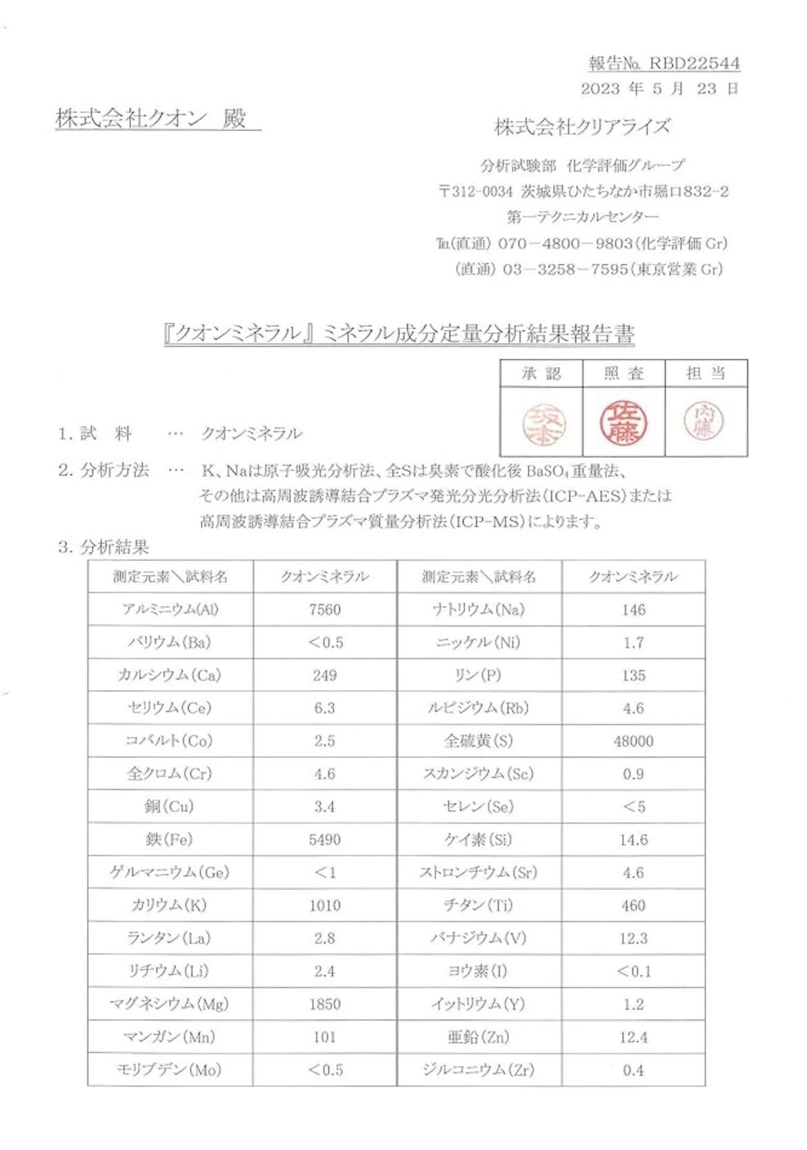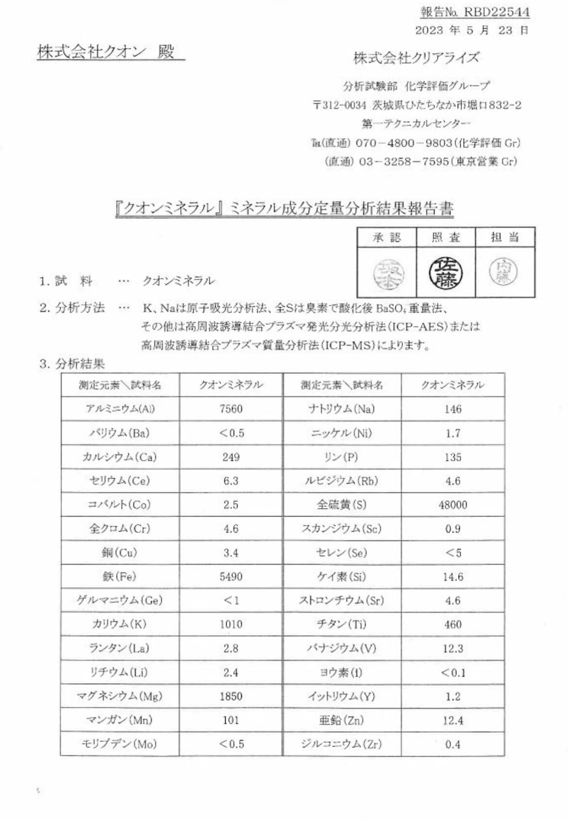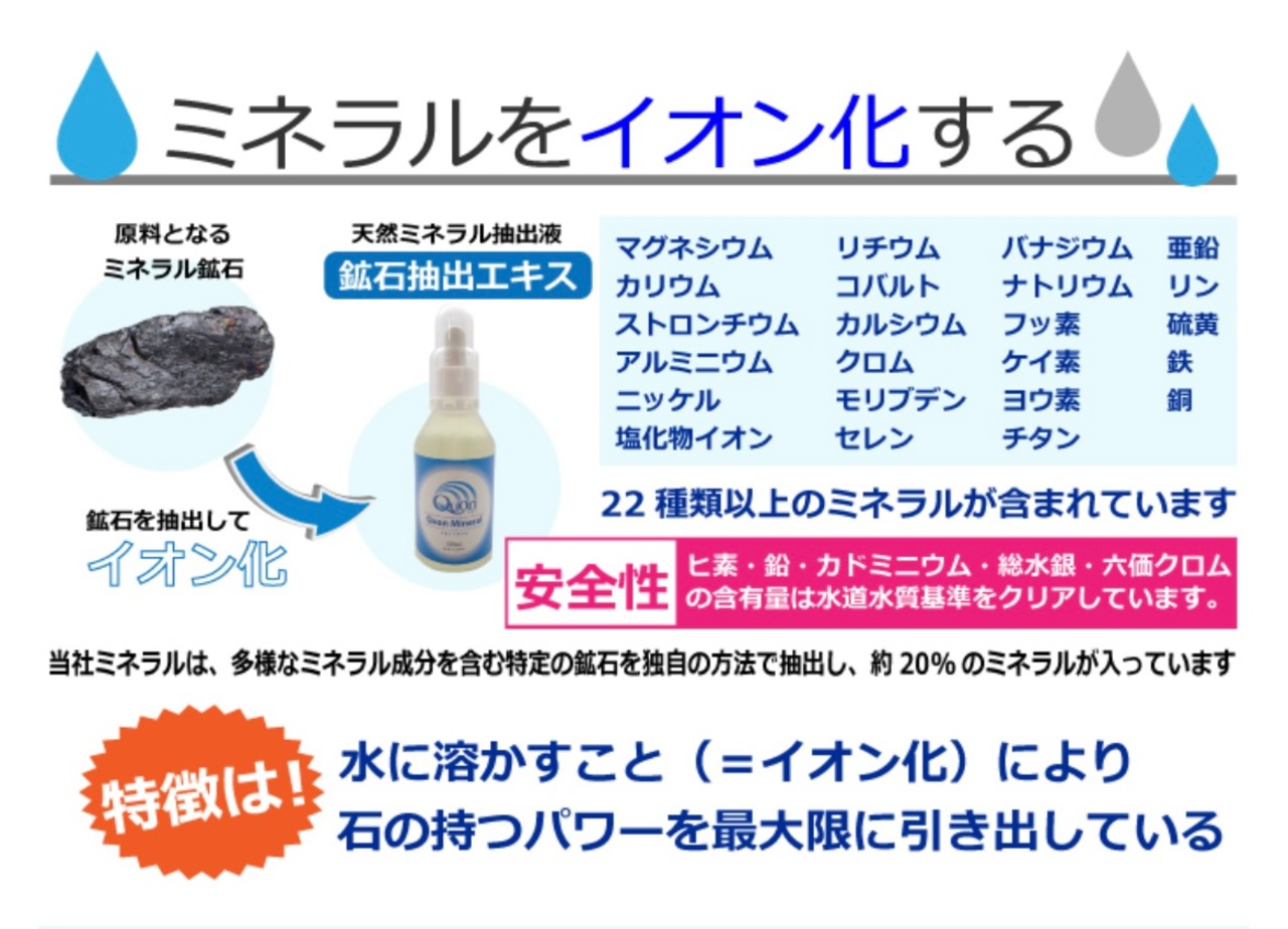 【お断り】一部の製品においてごく稀にボトル内のミネラル成分が凝集して浮遊する場合がありますが、これは原料の性質上どうしても避けられないもので、成分自体は純粋なミネラルのため、そのままお使いいただいても何ら問題はありませんが、万一、気になる場合はあらかじめスポイトなどで除去してからご使用いただくことをお勧めいたします。