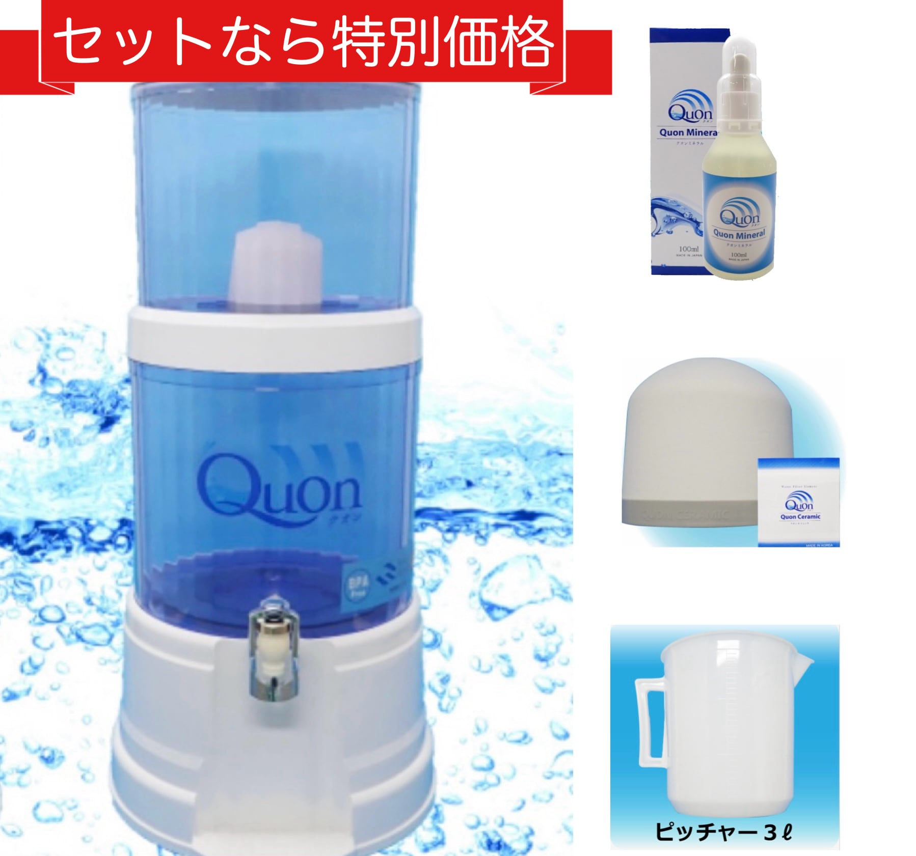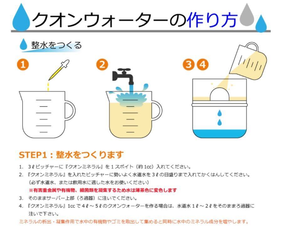 水道水に「クオンミネラル」を添加します。(3~4リットルに対しスポイト1cc)ミネラルの析出・凝集作用で水中の有機物や重金属を取り出して集めると同時に水中のミネラル成分を増やします。