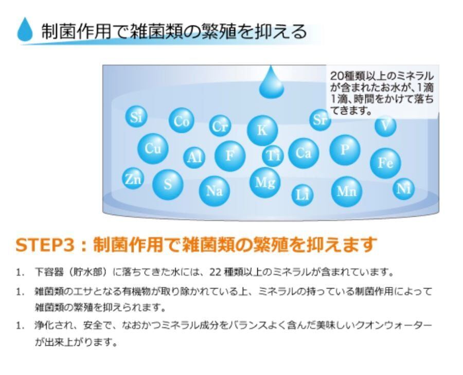 下容器(貯水部)に落ちてきた水には、22種類のミネラルが含まれています。雑菌類のエサとなる有機物が取り除かれている上、ミネラルの持っている制菌作用によって雑菌類の繁殖を抑えられます。