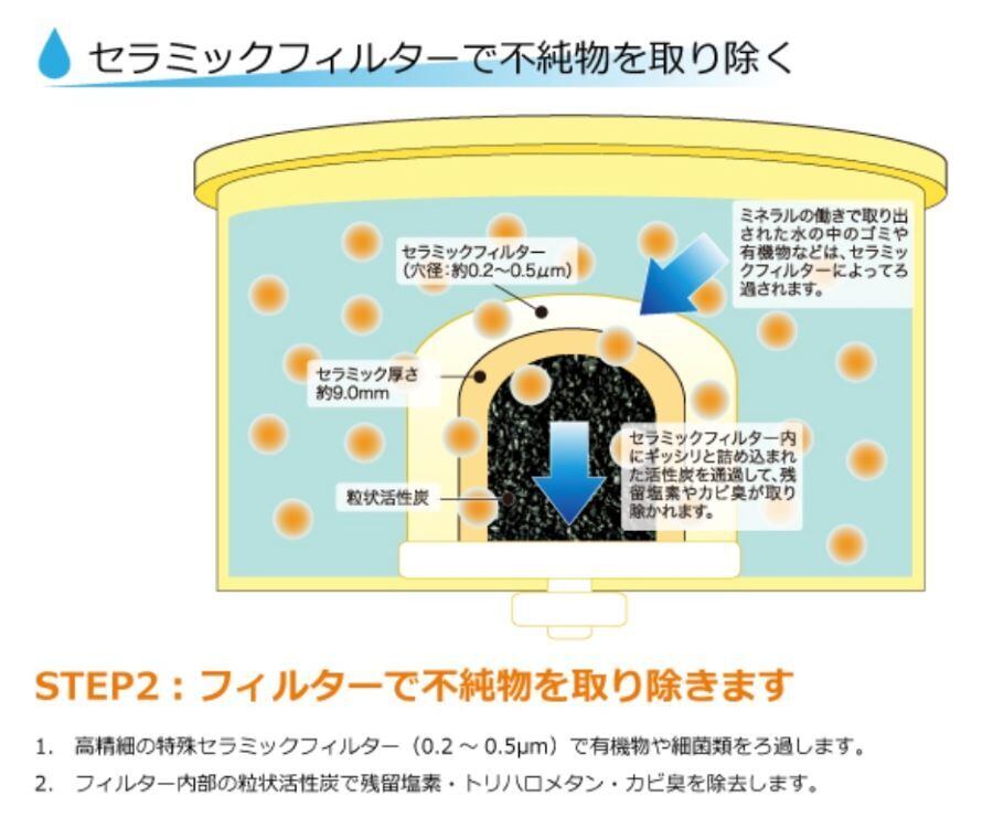 高精細の特殊セラミックフィルター(0.2~0.5um)で有機物や細菌類をろ過します。また、フィルター内部の粒状活性炭で残留塩素・カビ臭を除去します。